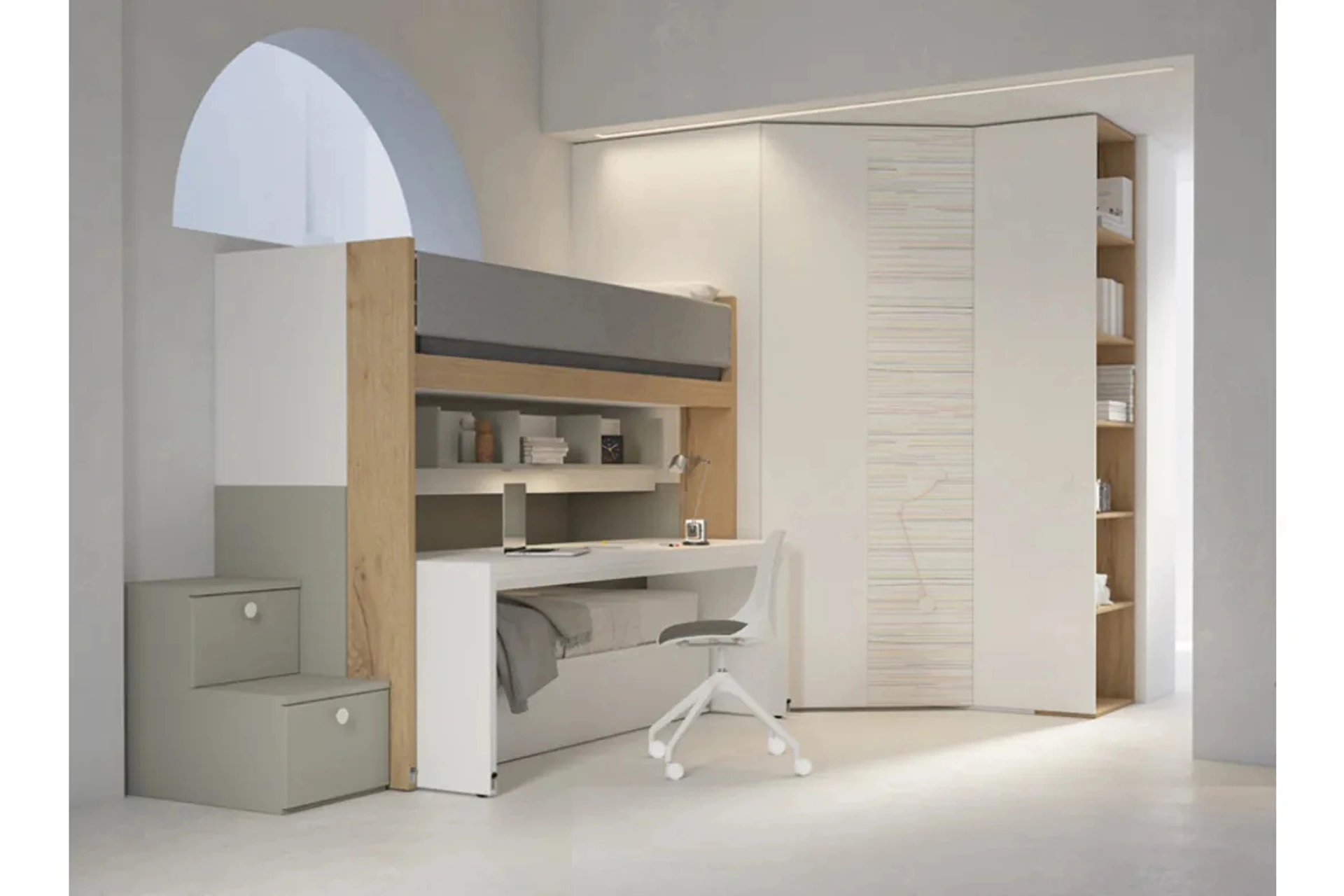 Arreda stanzette moderne con le Camerette salvaspazio Dielle! Il modello S03 Letti a soppalco in laccato opaco è per ragazzi.
