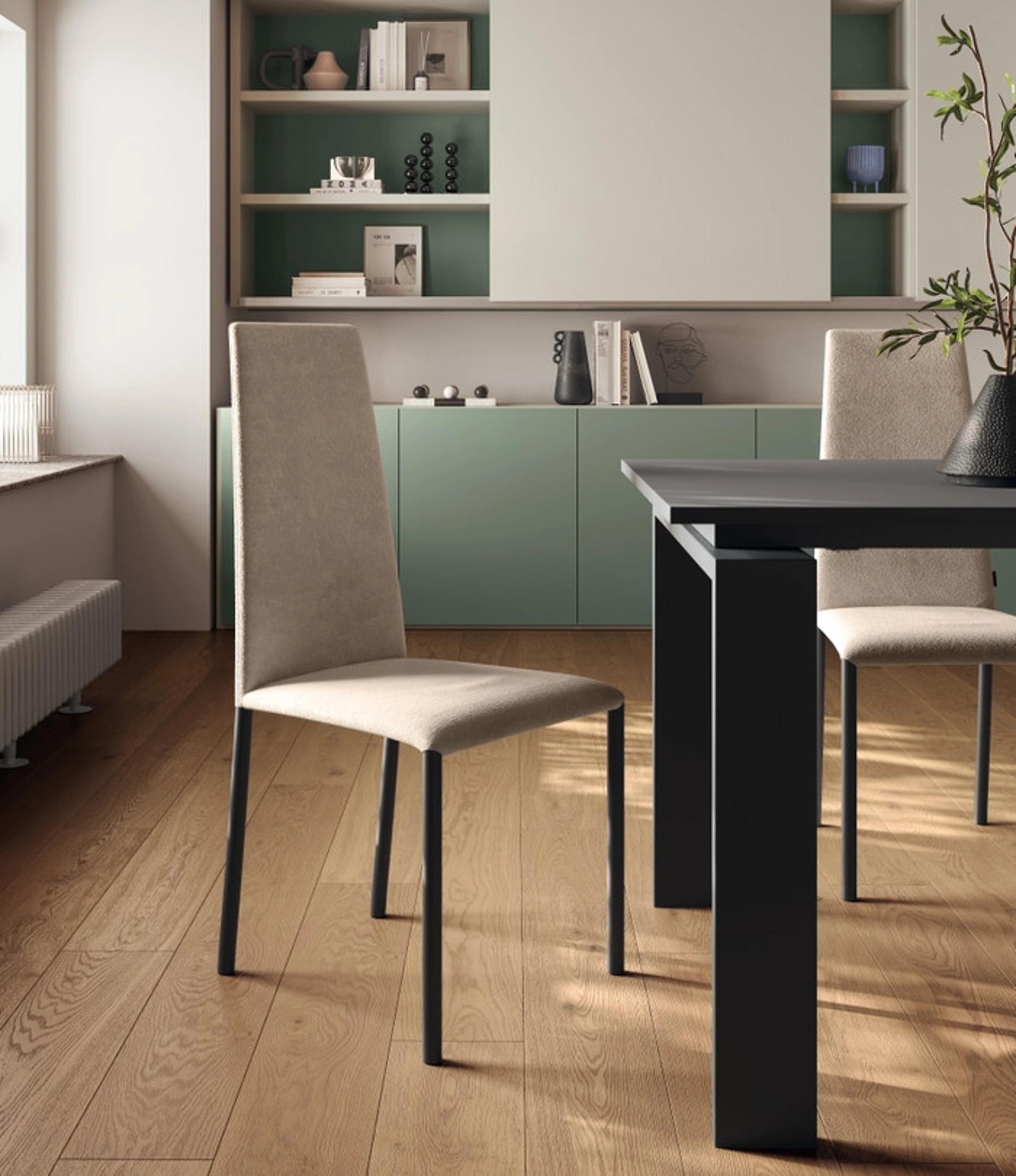 Cerchi una sedia da pranzo in tessuto? Clicca e scopri il modello Liam di Scavolini per completare i tuoi locali perfettamente.